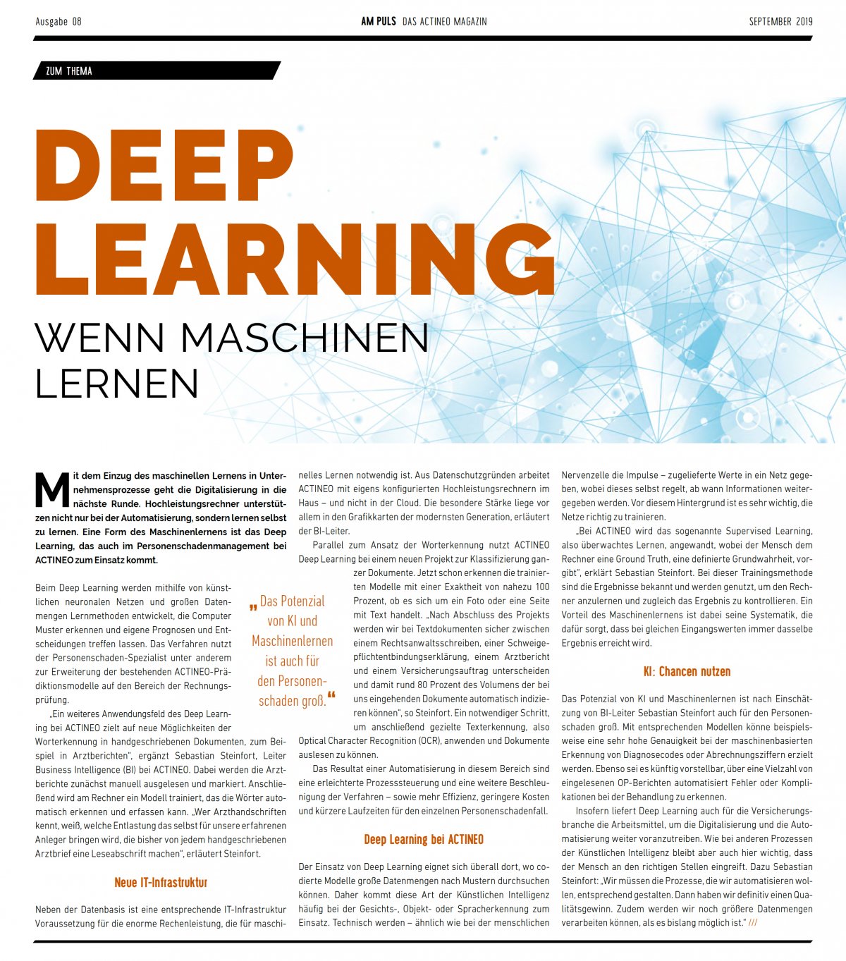 Themen wie Künstliche Intelligenz, Telemedizin und Aspekte der Versicherungswirtschaft stehen im Fokus des Kundenmagazins AM PULS, für das ich seit 2017 im Auftrag des Kölner Versicherungsdienstleisters ACTINEO redaktionelle Beiträge schreibe. Das Unternehmen mit seinen 150 Mitarbeiterinnen und Mitarbeitern ist deutscher Marktführer für die Digitalisierung und medizinische Einschätzung im Bereich Personenschaden und mittlerweile über Deutschland hinaus auch in anderen europäischen Ländern aktiv.