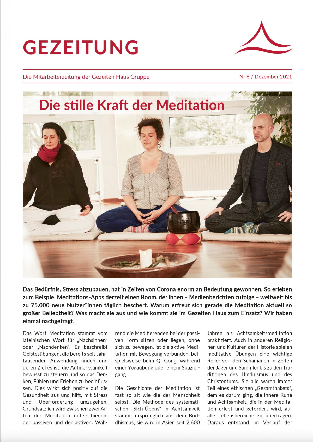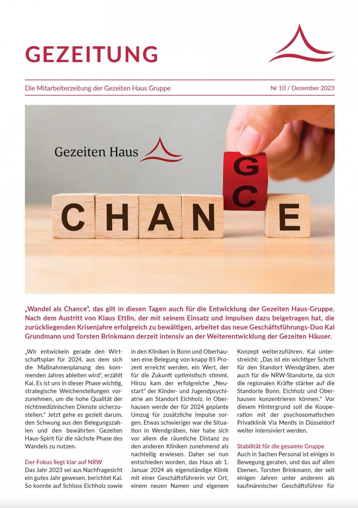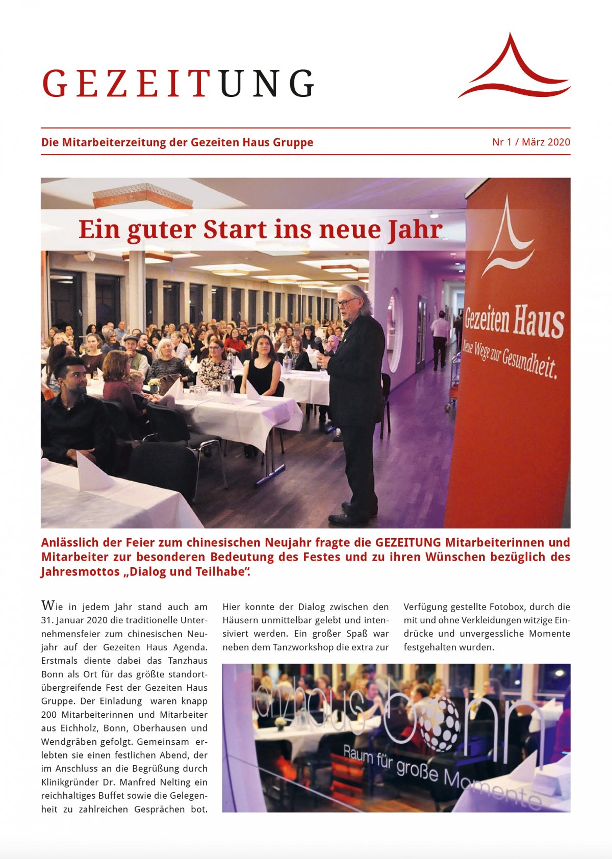 Die Gezeiten Haus Gruppe – das sind vier private Fachkrankenhäuser für Psychosomatische Medizin und Traditionelle Chinesische Medizin (TCM) an den Standorten Wesseling, Bonn, Oberhausen und Magdeburg (Sachsen-Anhalt). Im Jahr 2019 konzipierte ich im Rahmen der Strategie für die Interne Kommunikation gemeinsam mit dem Kunden das Mitarbeitermagazin „GEZEITUNG“, das ich seitdem redaktionell betreue. Inhaltlich werden sowohl medizinische Themen als auch solche der Unternehmenskultur aufgegriffen und journalistisch im Sinne des Storytelling vermittelt.
