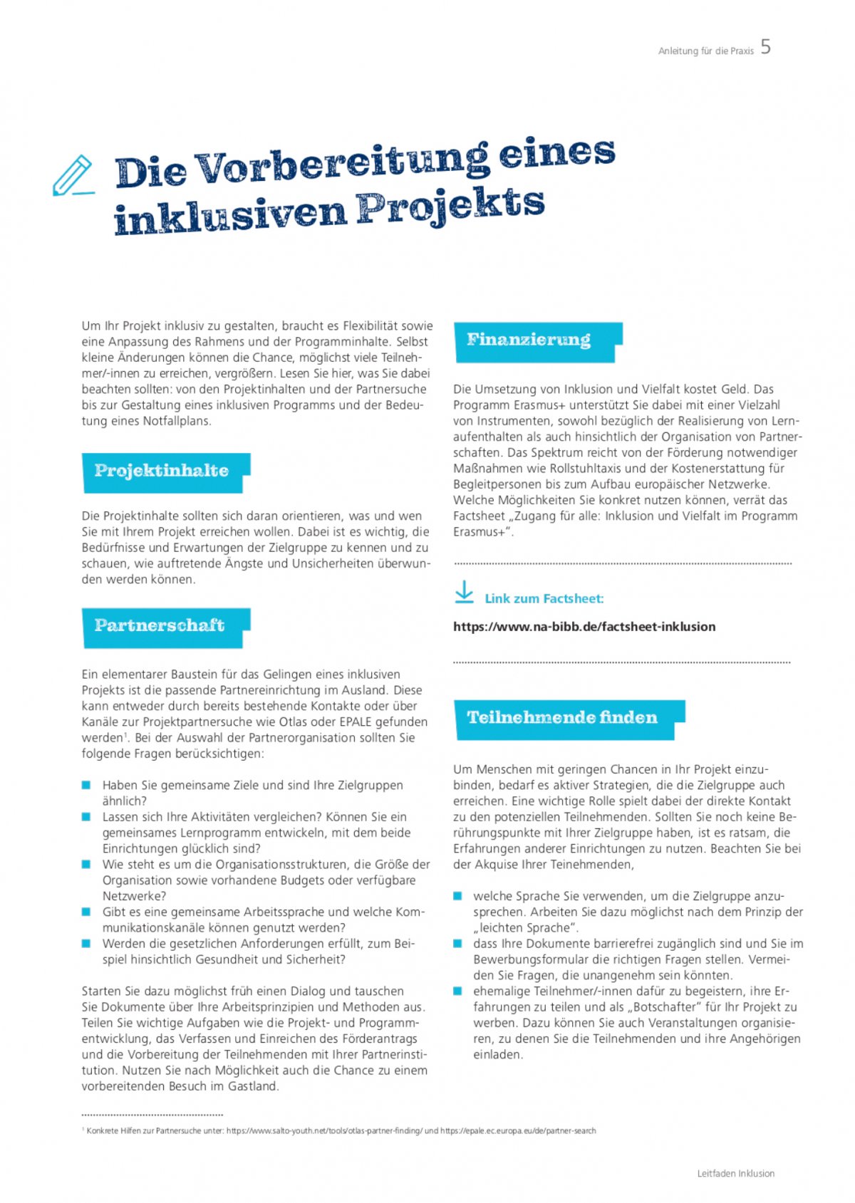 Inklusion und Vielfalt sind ein zentrales Thema im Programm Erasmus+ und den umgesetzten Projekten. Dabei geht es sowohl um Chancengleichheit und Barrierefreiheit als auch um Fairness und Vielfalt. Ziel ist eine breite Beteiligung von Menschen mit geringeren Chancen an der Gesellschaft, am Bildungssystem und an Erasmus+. Seit Mai 2023 liegt dazu nun der von mir redaktionell betreute „Leitfaden Inklusion“ der Nationalen Agentur beim Bundesinstitut für Berufsbildung (NA beim BIBB) vor, der neben Tipps und Erfahrungsberichten von Akteurinnen und Akteuren auch eine praktische Checkliste zu den wichtigsten Projektbausteinen und zwei Interviews mit Expertinnen und Experten aus Berufs- und Erwachsenenbildung enthält.