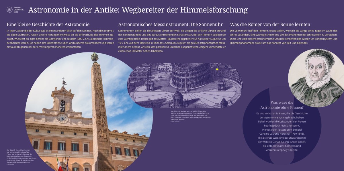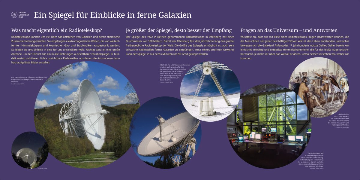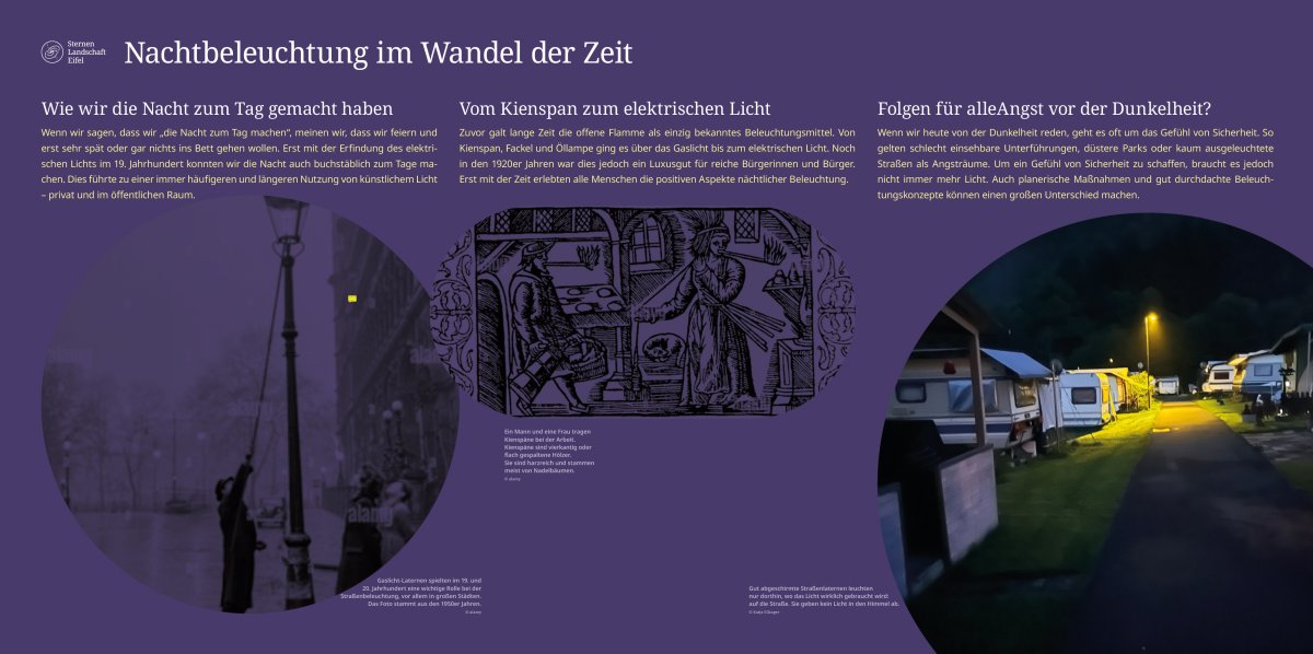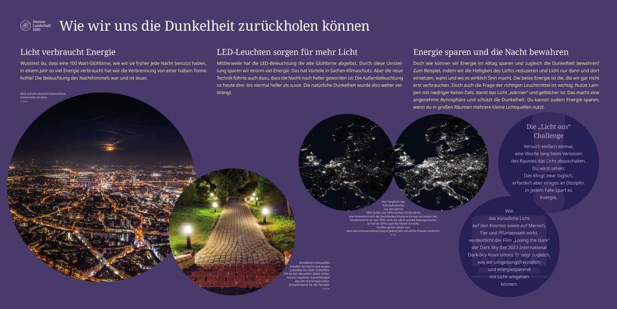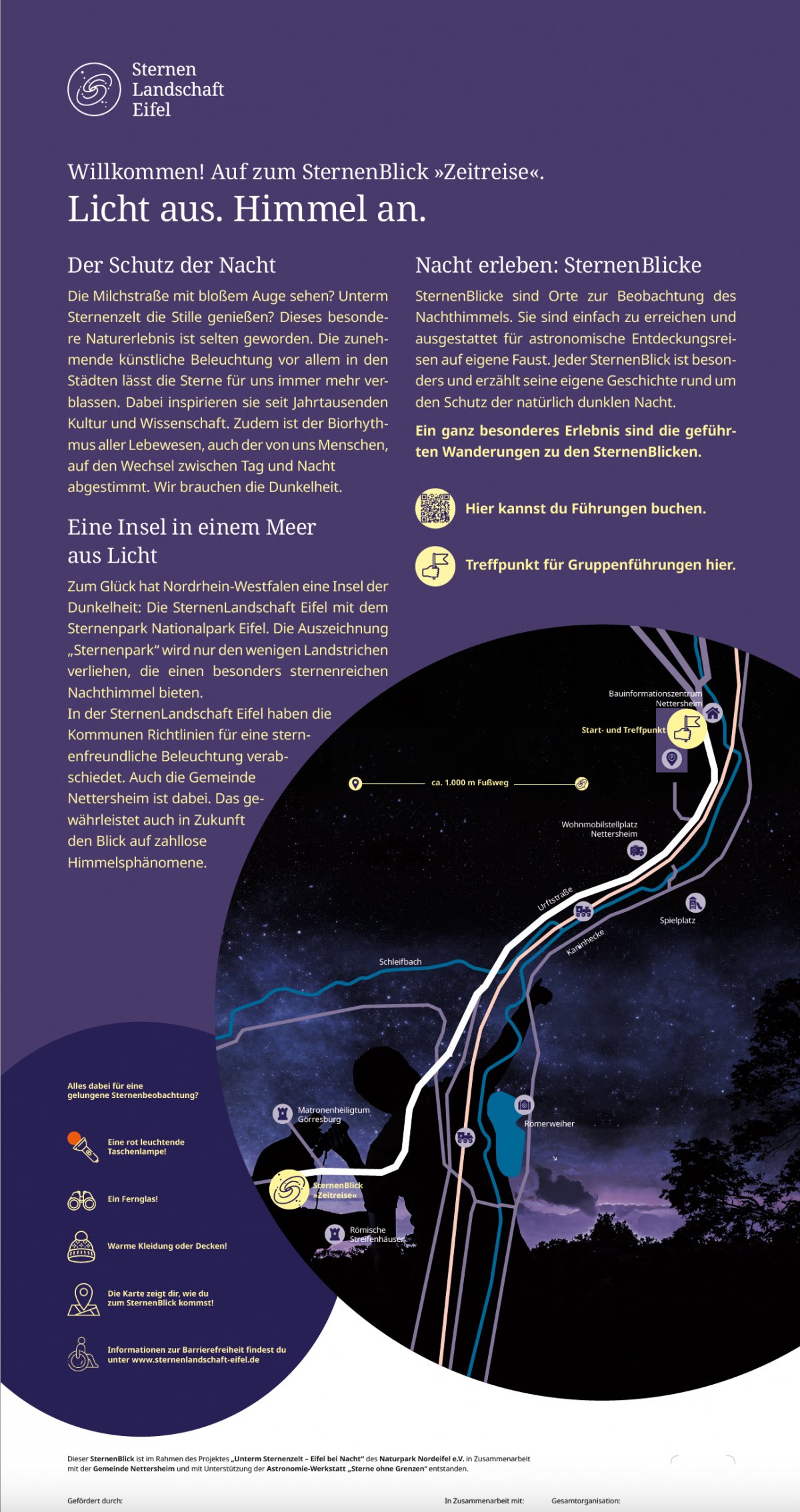 Die Eifel bei Nacht hat etwas anziehend Mystisches und wild Romantisches. Hier findet man noch echte Dunkelheit, frei von künstlichen Lichtquellen. Das macht die Eifel zu einem Ort, an dem man den Sternenhimmel auch ohne Fernrohr in ungeheurer Pracht erleben kann. Besonders schöne Sternenblicke bieten sich an ausgewählten SternenBlicken in der SternenLandschaft Eifel. Gemeinsam mit meiner Kollegin Anne Ameling und dem Grafiker Andreas Kruse erarbeitete ich im Jahr 2023 im Auftrag des Naturpark Nordeifel das Konzept und die Inhalte der Infotafeln an den verschiedenen Standorten zur Sternenbeobachtung in den beteiligten Kommunen. Offiziell eingeweiht wurde diese im Rahmen einer Auftaktveranstaltung im Dezember 2023.