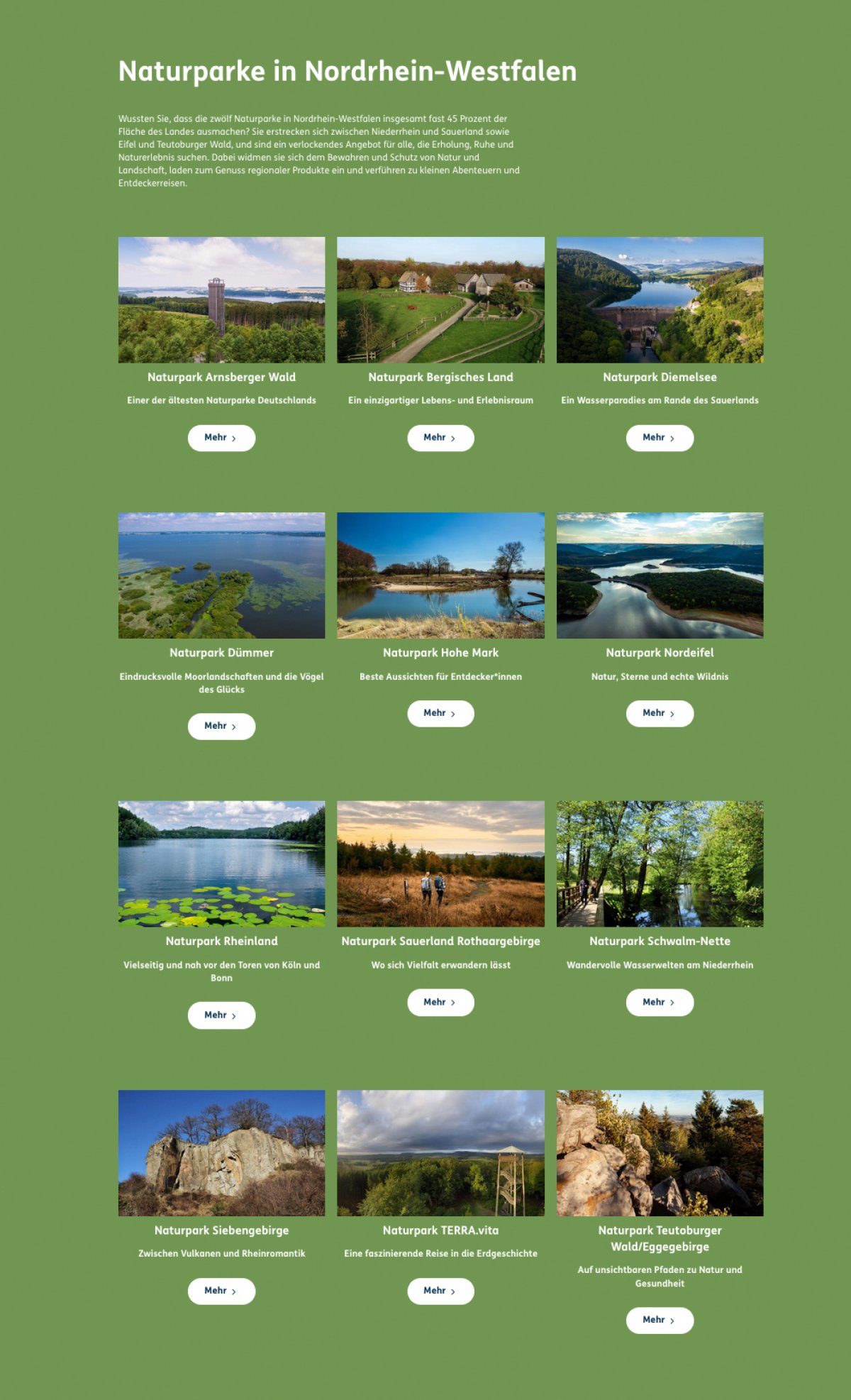 Unter dem Titel „Naturparke24“ luden die nordrhein-westfälischen Naturparke im Juni 2023 erstmals landesweit zu besonderen Aktionen ein, die Jung und Alt faszinierende Naturerlebnisse vor der eigenen Haustüre ermöglichen. Das Programm bot außergewöhnliche Veranstaltungen an faszinierenden Orten. Es zeigte, was Naturparkarbeit ausmacht und wie vielfältig die Aufgaben und Handlungsbereiche der Naturparke sind, deren Gebiet immerhin rund 45 Prozent der Landesfläche von NRW ausmacht. Ich schrieb die Texte für die Website und unterstützte den Naturparke NRW e.V. bei der Pressearbeit. Zudem moderierte ich die Pressekonferenz zum Start von „Naturparke 24 NRW“.
